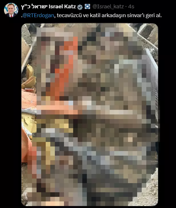 İsrail Dışişleri Bakanı Katz, Cumhurbaşkanı Erdoğan'ı etiketleyerek dün öldürüldüğü duyurulan Hamas lideri Yahya Sinvar'ın ölmüş haldeki fotoğrafını paylaştı ve "Tecavüzcü ve katil arkadaşın Sinvar’ı geri al" yazdı.