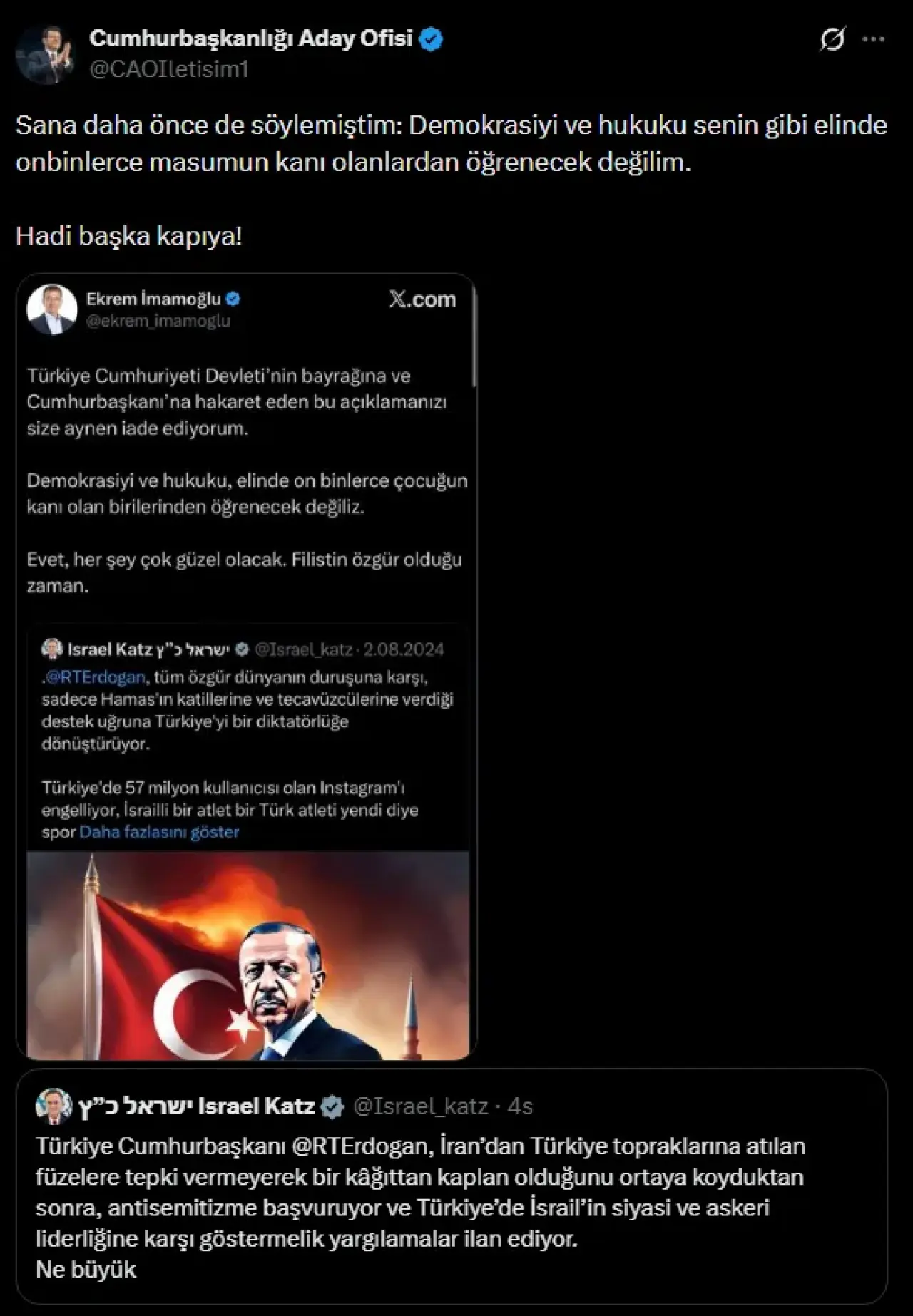 İsrail Dışişleri Bakanı Katz'ın sosyal medya üzerinden kullandığı yakışıksız ifadelere muhalefet cephesinden de gecikmeden yanıt geldi. İstanbul Büyükşehir Belediye Başkanı Ekrem İmamoğlu, Katz'ın demokrasi ve hukuk referanslarını eleştirerek, "Elinde on binlerce masumun kanı olanlardan öğrenecek bir şeyimiz yok. Hadi başka kapıya!" sözleriyle tepkisini dile getirdi.