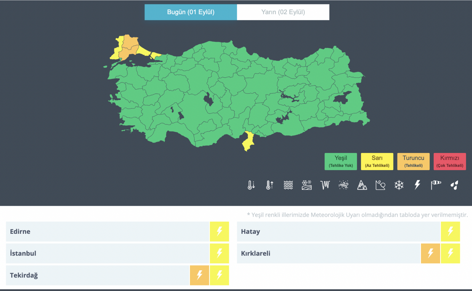 Meteoroloji’den “Yağışların, İç Anadolu’nun kuzeybatısı, Batı Karadeniz’in iç kesimleri, İstanbul, Kırklareli, Tekirdağ, Çanakkale, Bilecik, Afyonkarahisar, Kütahya, Osmaniye çevreleri, Adana’nın kuzey ve doğusu ile Kahramanmaraş’ın batı, Hatay’ın kıyı kesimlerinde yer yer kuvvetli olması beklendiğinden ani sel, su baskını, yıldırım, yerel dolu yağışı ve yağış anında kuvvetli rüzgâr gibi olumsuzluklara karşı dikkatli tedbirli olunması gerekmektedir” uyarısı geçildi.