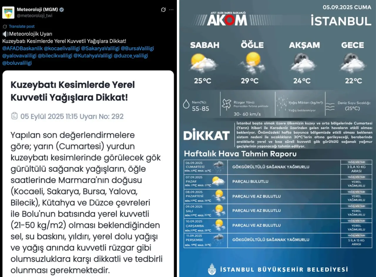 AKOM ise Karadeniz üzerinden gelen serin ve yağışlı havanın Cumartesi’den itibaren İstanbul’da etkili olacağını bildirdi. Kent genelinde sıcaklıkların 30 derecenin altına ineceği, gök gürültülü sağanaklarla birlikte kısa süreli kuvvetli yağış geçişlerinin yaşanacağı ifade edildi.