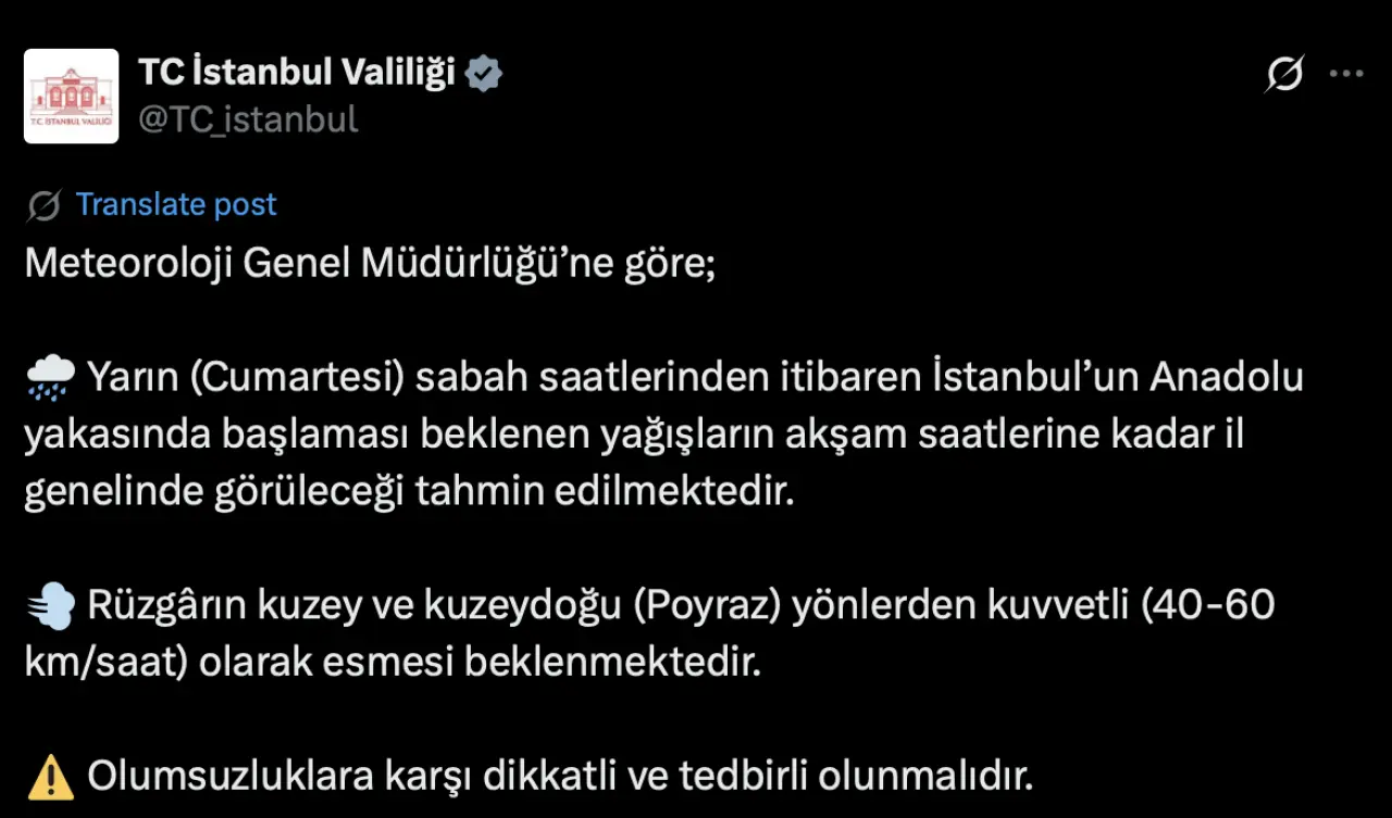 İstanbul Valiliği de sosyal medya hesabından yaptığı paylaşımda, Cumartesi sabah saatlerinden itibaren Anadolu yakasında başlayacak yağışların akşam saatlerine kadar kent genelinde etkili olacağını duyurdu. Rüzgârın kuzey ve kuzeydoğudan 40-60 km/saat hızla esmesinin beklendiği vurgulandı.