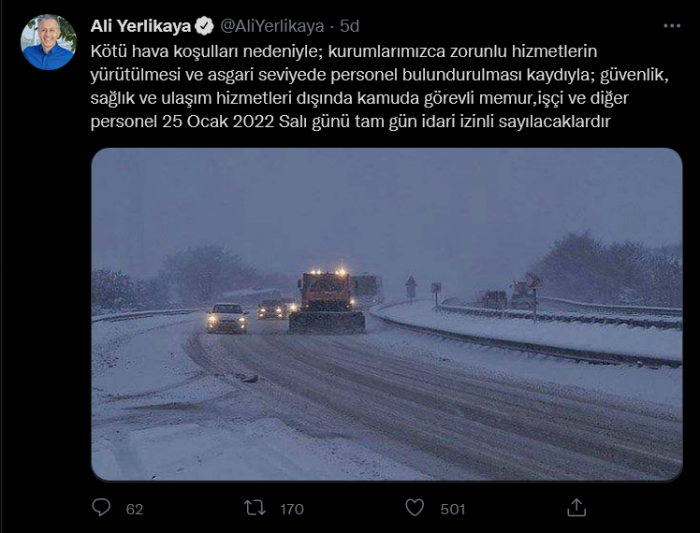 İstanbul Valisi Ali Yerlikaya, Twitter hesabından kentte yaşanan olumsuz hava koşulları sebebiyle güvenlik, sağlık ve ulaşım hizmetleri dışındaki kamu görevlilerinin 25 Ocak 2022 tarihinde idari izinli olacaklarını açıkladı. Ali Yerlikaya'nın açıklaması şöyle: