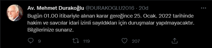 Bugün 01.00 itibariyle alınan karar gereğince 25. Ocak. 2022 tarihinde hakim ve savcılar idari izinli sayıldıkları için duruşmalar yapılmayacaktır. Bilgilerinize sunarız.