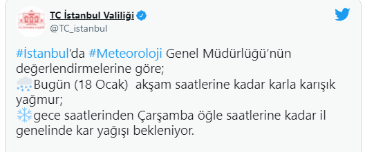 İstanbul Valiliği'nin Twitter hesabından yapılan açıklamada, "İstanbul’da Meteoroloji Genel Müdürlüğü’nün değerlendirmelerine göre; Bugün (18 Ocak) akşam saatlerine kadar karla karışık yağmur, gece saatlerinden Çarşamba öğle saatlerine kadar il genelinde kar yağışı bekleniyor" denildi.