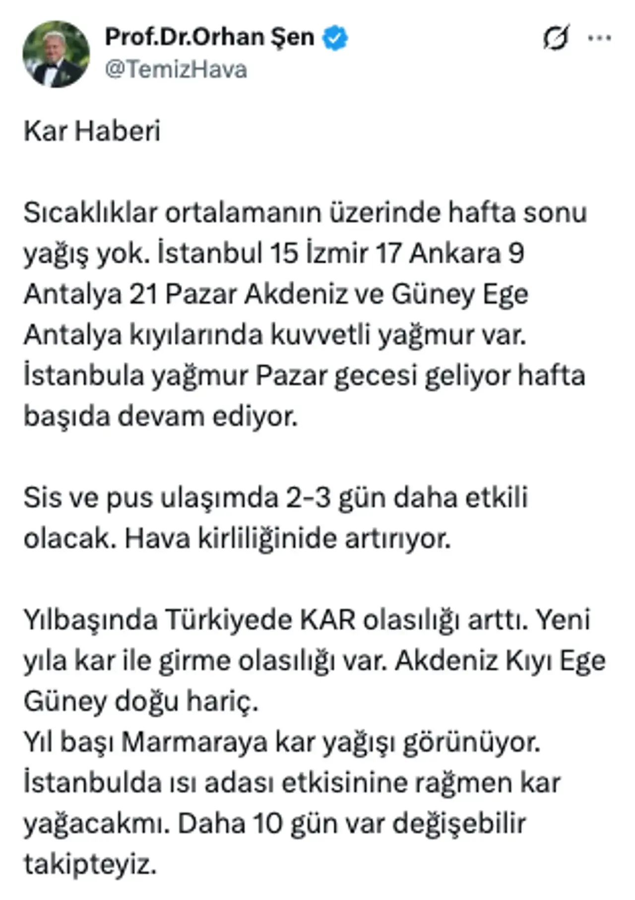 Meteoroloji Uzmanı Orhan Şen, sosyal medya hesabından yaptığı açıklamada şu ifadeleri kullandı: