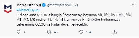 Metro İstanbul paylaşımında "2 Nisan saat 00.00 itibarıyla Ramazan ayı boyunca M1, M2, M3, M4, M5, M6, M7, M9 metro, T1, T4, T5 tramvay ve F1 füniküler hatlarımızda seferlerimiz 02.00’ye kadar devam edecektir." ifadelerine yer verildi.