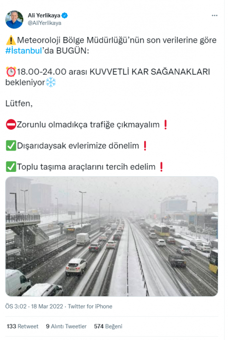 İstanbul Valisi Ali Yerlikaya, sosyal medya hesabı Twitter'dan kar yağışı hakkında uyarılarda bulundu.