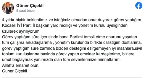 Çiçekli, "4 yıldır hiçbir beklentimiz ve isteğimiz olmadan onur duyarak görev yaptığım İYİ Parti Kocaeli İl Başkan Yardımcılığı ve Yönetim Kurulu üyeliğinden üzülerek ayrılıyorum. Görev yaptığım süre içerisinde bana, partimi temsil etme onurunu yaşatan tüm çalışma arkadaşlarıma, yönetim kurulunda birlikte çalıştığım dostlarıma, görev yaptığım süre zarfında bizden desteğini esirgemeyen iyi insanlara, sivil toplum kuruluşlarına, basında görev yapan emektar kardeşlerime, bizlere umut bağlayarak yanımızda olan tüm sevenlerimize minnettarım. Allah'a emanet olun" dedi.