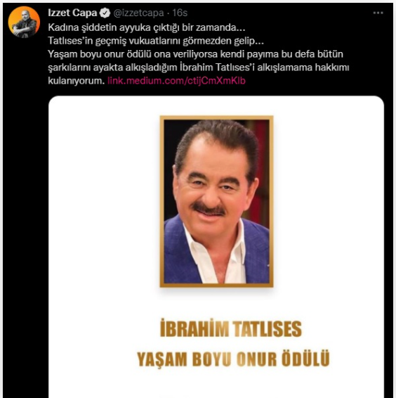 Çapa da 'Yaşam Boyu Onur Ödülü'nün kadına yönelik şiddetle ve kadınlara yönelik söylemleriyle sıkça gündeme gelen İbrahim Tatlıses'e verilmesine isyan etmişti.