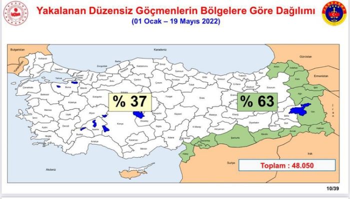 ”Bizim için önemli olan düzensiz göçmenlere ülkenin sınırlarından girmeden müdahale etmek. Jandarma sorumluluk sahasında geçen yıl 1 Ocak19 Mayıs tarihlerinde 26 bin 427 düzensiz göçmen ve 856 organizatör yakalanırken, bu yıl aynı dönemlerde 48 bin 50 düzensiz göçmen ve 1488 organizatör yakalandı. Yakalamaların yüzde 63’ü sınır illerinde gerçekleşti.”