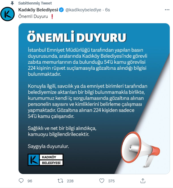 Açıklamada “İstanbul Emniyet Müdürlüğü tarafından yapılan basın duyurusunda aralarında Kadıköy Belediyesi'nde görevli zabıta memurlarının da bulunduğu 54'ü kamu görevlisi 224 kişinin rüşvet suçlamasıyla gözaltına alındığı bilgisi bulunmaktadır. Konuyla ilgili savcılık ya da emniyet birimleri tarafından belediyemize aktarılan bir bilgi bulunmamakla birlikte kurumumuz kendi iç sorgulamasında gözaltına alınan personelin sayısını ve kimliklerini belirleme çalışması yapmaktadır. Gözaltına alınan 224 kişiden sadece 54'ü kamu çalışanıdır. Sağlıklı ve net bir bilgi alındıkça kamuoyu bilgilendirilecektir” denildi.