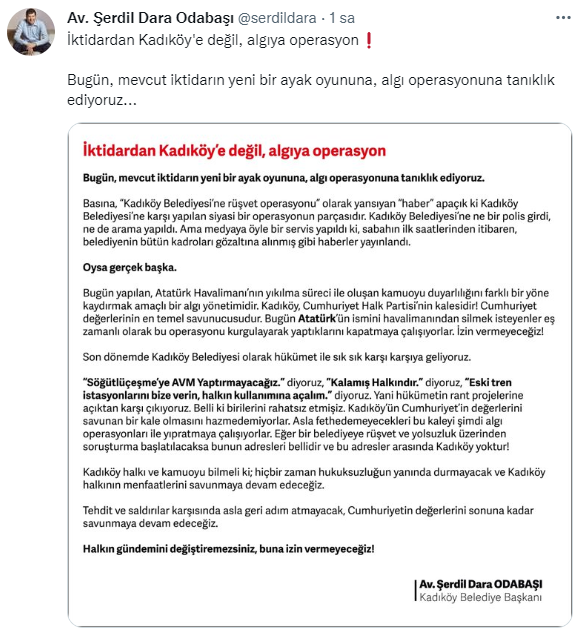 “İktidardan Kadıköy’e değil, algıya operasyon. Bugün, mevcut iktidarın yeni bir ayak oyununa, algı operasyonuna tanıklık ediyoruz” paylaşımında bulunan Odabaşı “Basına ‘Kadıköy Belediyesi'ne rüşvet operasyonu olarak yansıyan ‘haber' apaçık ki Kadıköy Belediyesi'ne karşı yapılan siyasi bir operasyonun parçasıdır. Kadıköy Belediyesi'ne ne bir polis girdi, ne de arama yapıldı. Ama medyaya öyle bir servis yapıldı ki, sabahın ilk saatlerinden itibaren belediyenin bütün kadroları gözaltına alınmış gibi haberler yayınlandı” dedi.