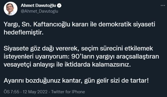 "Yargı, Sn. Kaftancıoğlu kararı ile demokratik siyaseti hedeflemiştir. Siyasete göz dağı vererek, seçim sürecini etkilemek isteyenleri uyarıyorum: 90’ların yargıyı araçsallaştıran vesayetçi anlayışı ile iktidarda kalamazsınız. Ayarını bozduğunuz kantar, gün gelir sizi de tartar!"
