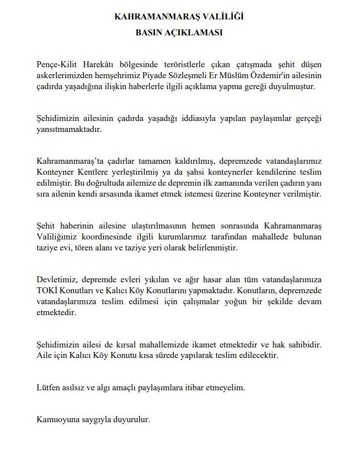 “Pençe-Kilit Harekatı bölgesinde teröristlerle çıkan çatışmada şehit düşen askerlerimizden hemşehrimiz Piyade Sözleşmeli Er Müslüm Özdemir'in ailesinin çadırda yaşadığına ilişkin haberlerle ilgili açıklama yapma gereği duyulmuştur.