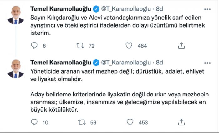 Kemal Kılıçdaroğlu'nun Alevi olmasıyla ilgili olarak edilen sözlere karşılık Temel Karamollaoğlu, “Aday belirleme kriterlerinde liyakatin değil de ırkın veya mezhebin aranması; geleceğimize yapılabilecek en büyük kötülük” ifadesini kullandı.