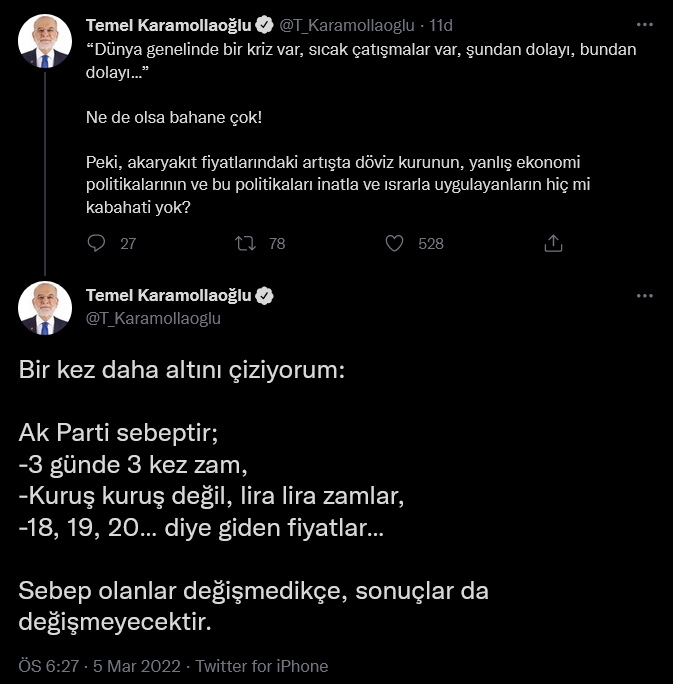 Saadet Partisi Genel Başkanı Temel Karamollaoğlu, Twitter hesabından ardı ardına gelen akaryakıt zamlarına tepki gösterdi. Temel Karamollaoğlu, akaryakıt zamlarının sebebi olarak savunulan sözlere paylaşarak, "yanlış ekonomi" politikalarını ısrarla uygulayanların hiç mi kabahatinin olup olmadığını sordu.