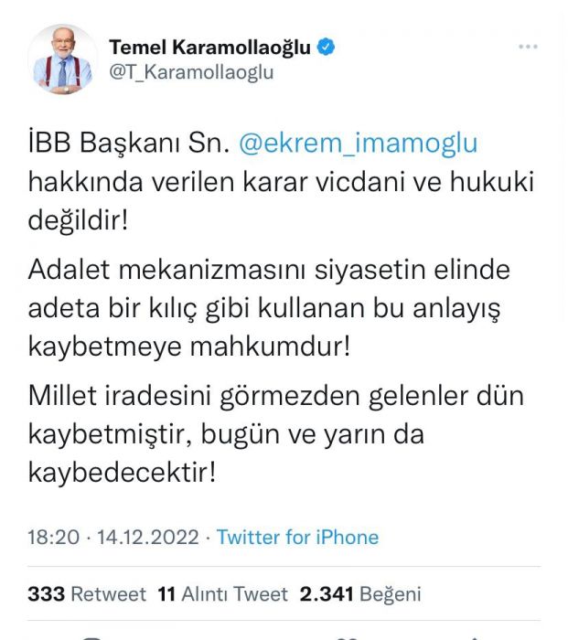 Sosyal medya hesabından açıklama yapan Karamollaoğlu, "İBB Başkanı Sn. Ekrem İmamoğlu hakkında verilen karar vicdani ve hukuki değildir! Adalet mekanizmasını siyasetin elinde adeta bir kılıç gibi kullanan bu anlayış kaybetmeye mahkumdur! Millet iradesini görmezden gelenler dün kaybetmiştir, bugün ve yarın da kaybedecektir!" ifadelerini kullandı.