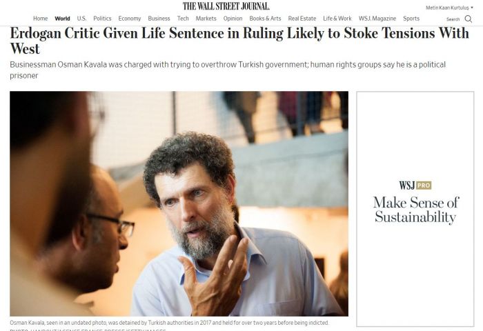 ABD'nin ve dünyanın en önde gelen finans yayınlarından Wall Street Journal ise, "Erdoğan muhalifine müebbet hapis cezası; karar büyük ihtimalle Batı'yla ilişkileri kötü etkileyecek" başlığıyla kararı duyurdu. WSJ, pazartesi günkü karar duruşmasının Türkiye'de yargının ne kadar erozyona uğradığının bir sembolü olduğu değerlendirmesinde bulundu. Bloomberg de Türkiye'nin Batılı müttefiklerinin bu davayı "Türk yargısının bağımsızlık testi" olarak gördüğünü ifade etti.