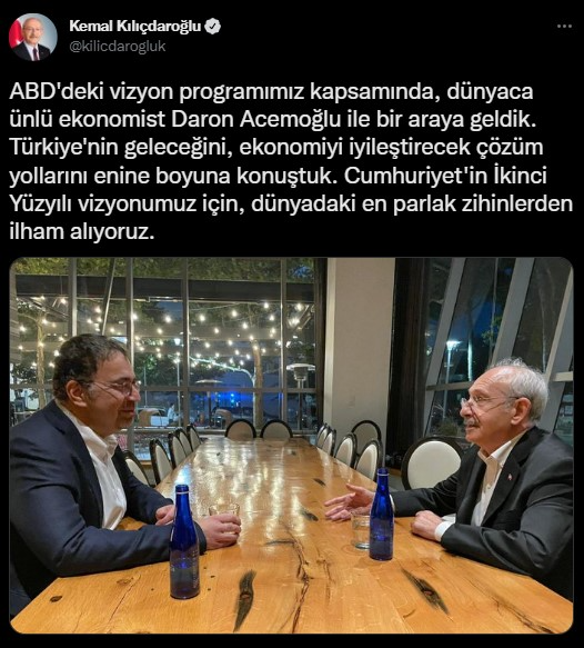 ABD'de bir dizi temaslar gerçekleştiren CHP lideri Kılıçdaroğlu, ekonomist Daron Acemoğlu ile görüşme yaptı. Buluşmayı sosyal medya hesabından yaptığı bir paylaşımla duyuran Kılıçdaroğlu, "ABD'deki vizyon programımız kapsamında, dünyaca ünlü ekonomist Daron Acemoğlu ile bir araya geldik. Türkiye'nin geleceğini, ekonomiyi iyileştirecek çözüm yollarını enine boyuna konuştuk. Cumhuriyet'in İkinci Yüzyılı vizyonumuz için, dünyadaki en parlak zihinlerden ilham alıyoruz" notunu paylaştı.