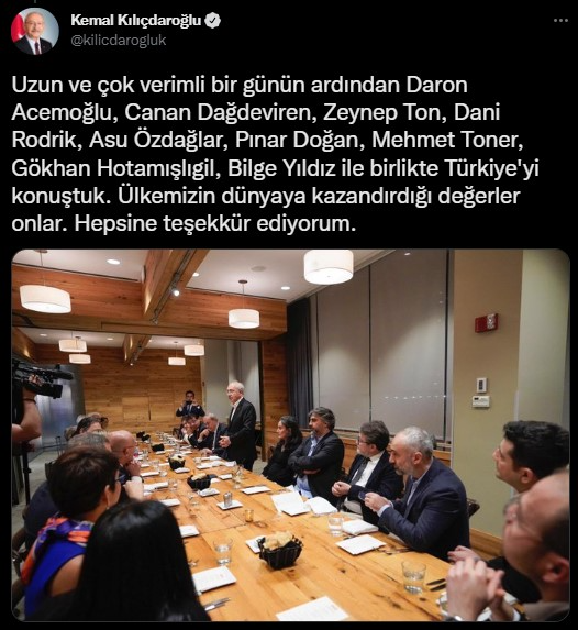 ABD gezisinde birçok akademisyen ve bilim insanıyla görüşme yapan Kılıçdaroğlu; akşam yemeğinde buluştuğu isimlere teşekkür ederek, "Uzun ve çok verimli bir günün ardından Daron Acemoğlu, Canan Dağdeviren, Zeynep Ton, Dani Rodrik, Asu Özdağlar, Pınar Doğan, Mehmet Toner, Gökhan Hotamışlıgil, Bilge Yıldız ile birlikte Türkiye'yi konuştuk. Ülkemizin dünyaya kazandırdığı değerler onlar. Hepsine teşekkür ediyorum." ifadesini yazdı.