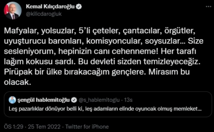 Cumhuriyet Halk Partisi (CHP) Genel Başkanı Kemal Kılıçdaroğlu, sosyal medya hesabından yeni bir paylaşımda bulundu. Suikast sonucu katledilen Necip Hablemitoğlu'nun eşi, akademisyen ve yazar, Prof. Dr. Şengül Hablemitoğlu'nun bir tweetini alıntılayan Kılıçdaroğlu, dikkat çeken ifadeler kullandı.