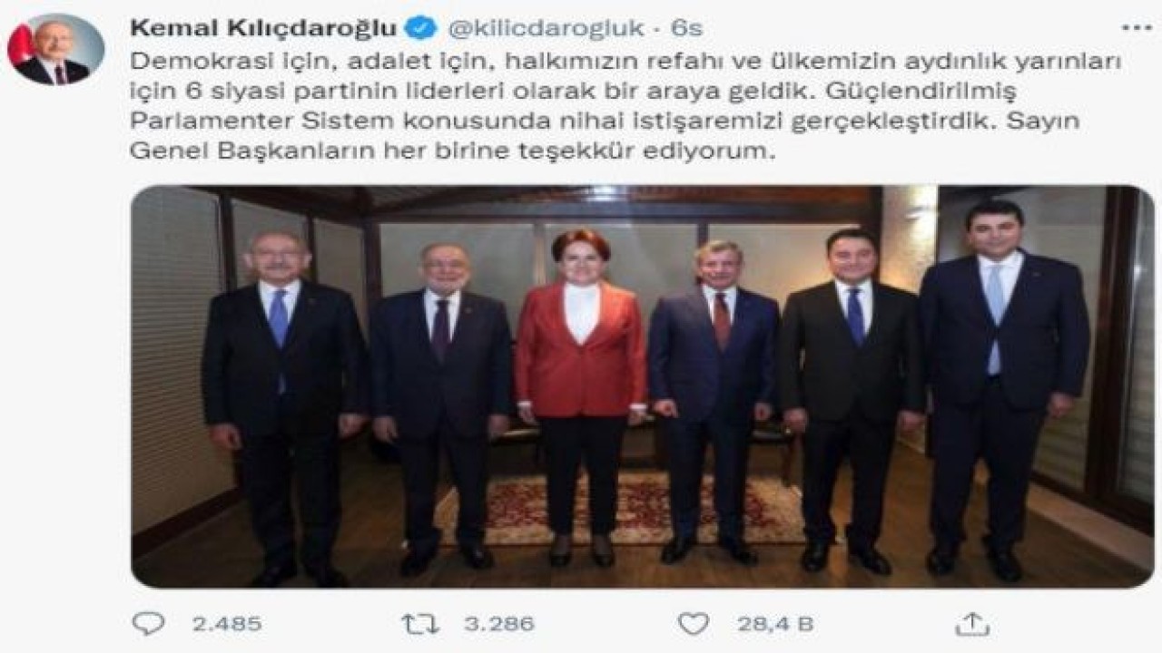 6 muhalefet partisinin genel başkanları CHP lideri Kemal Kılıçdaroğlu'nun çağrısıyla dün akşam 5 saatten fazla süren kritik bir toplantı yaptı. Tarihi zirvenin ardından gece yarısı Twitter hesabından bir açıklama yapan Kılıçdaroğlu, "Güçlendirilmiş Parlamenter Sistem konusunda nihai istişaremizi gerçekleştirdik. Sayın Genel Başkanların her birine teşekkür ediyorum" ifadesini kullandı.