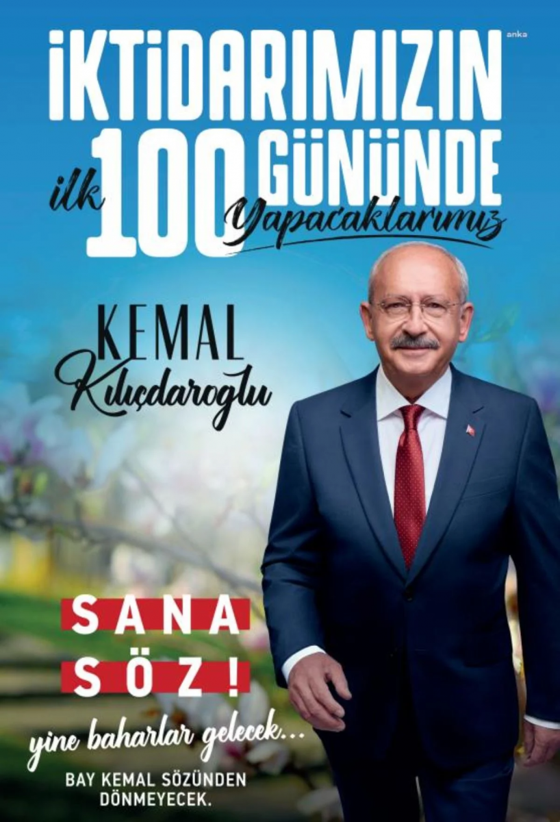 İlk 100 günlük hedeflerini sıralayan CHP, Cumhurbaşkanlığı Sarayı’nın boşaltılarak Çankaya Köşkü’nün kullanılması, esnafın borçlarının faizlerinin silinmesi ve tartışmalı bürokratların görevinden alınması gibi vaatlerde bulundu.