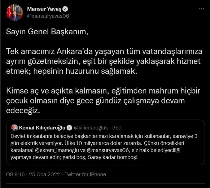 ABB Başkanı Mansur Yavaş, CHP Lideri Kılıçdaroğlu'nun tweetini alıntılayarak şunları söyledi: