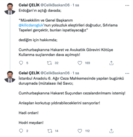 Çelik Twitter hesabından yaptığı paylaşımda, "Erdoğan’ın açtığı davada; 'Müvekkilim ve Genel Başkanım Kılıçdaroğlu’nun yolsuzluk eleştirileri doğrudur, Sıfırlama Tapeleri gerçektir, bunları ispatlayacağız' dediğim için hakkımda; Cumhurbaşkanı'na Hakaret ve Avukatlık Görevini Kötüye Kullanma suçlarından dava açılmıştı! İstanbul Anadolu 6. Ağır Ceza Mahkemesinde yapılan bugünkü duruşmada (mütalaası ile) Savcı; Cumhurbaşkanına Hakaret Suçundan cezalandırılmamı istemiş! Anlaşılan korkutup yıldırabileceklerini sanıyorlar! Hadi ordan! Hodri meydan!" ifadesini kullandı.