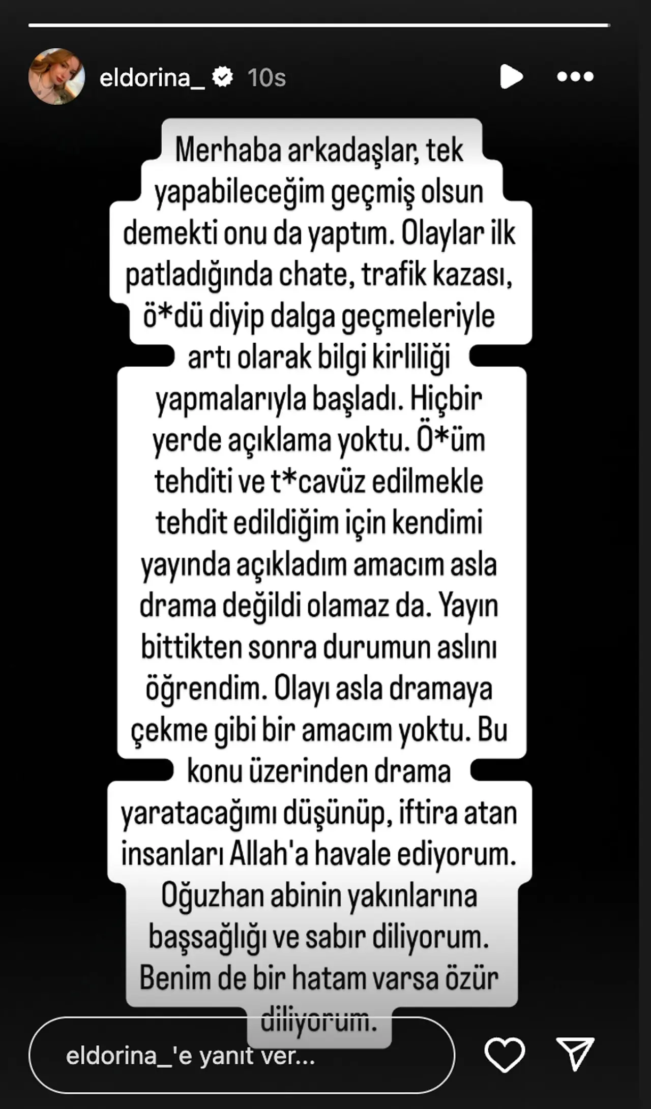 Tepkilerin ardından sosyal medya hesabından da açıklama yapan Eldorina, kendisine yönelik tehditleri paylaştı. Açıklamasında şu ifadelere yer verdi: