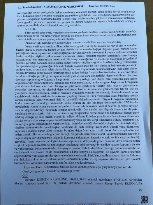 Kılıçdaroğlu’nun 50.000 TL Erdoğan’a verilmesine, 10 bin TL Burak Erdoğan’a, 10 bin TL Bilal Erdoğan’a, 10 bin TL Esra Albayrak’a, 10 bin TL Sümeyye Erdoğan’a, 10 bin TL de Mustafa Erdoğan’a tazminat ödenmesine hükmedildi.