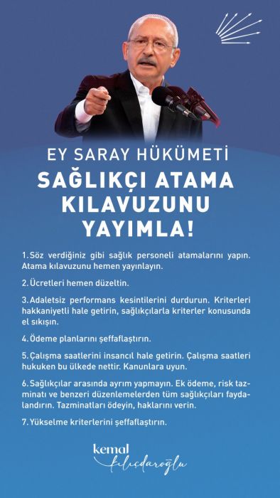 CHP Lideri Kemal Kılıçdaroğlu, sağlık emekçileri ile görüşmesinden sonra sosyal medya hesabından yazılı açıklama yayımladı. Kemal Kılıçdaroğlu, iktidara seslenerek sağlık emekçilerinin taleplerinin bir an önce çözülmesini istedi ve taleplerin çözüme kavuşturulmaması halinde iktidara geldiklerinde çözeceklerini ifade etti. Sağlık emekçilerinin 7 maddelik talepleri şöyle:
