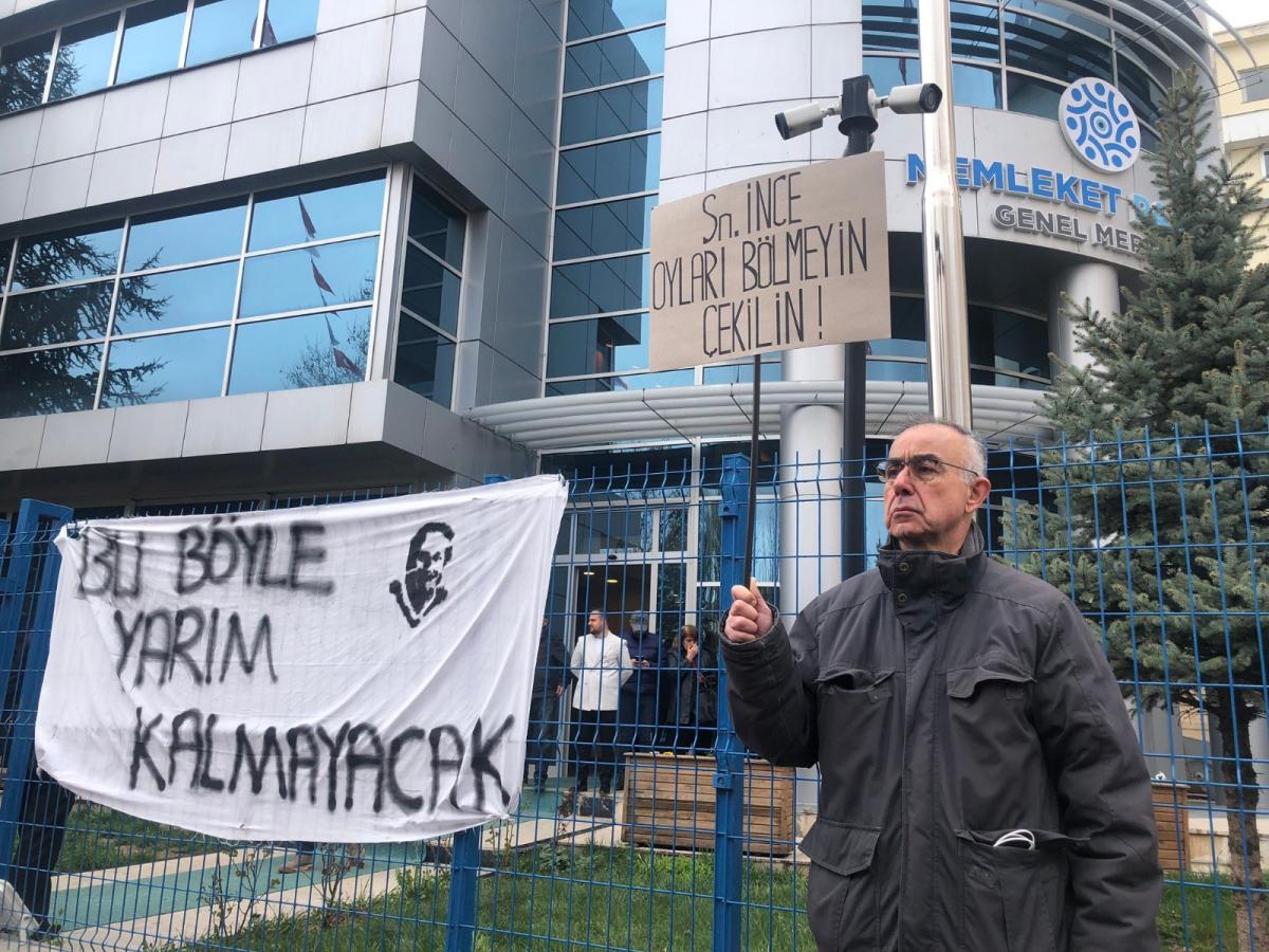 Görüşme öncesi bir kişi Memleket Partisi Genel Merkezi önünde, “Sn. İnce oyları bölmeyin çekilin” pankartı açtı.