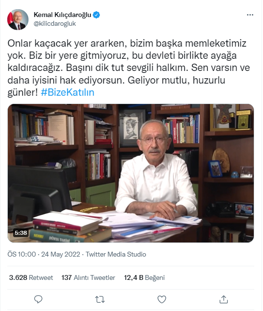 CHP lideri Kemal Kılıçdaroğlu, sosyal medyadan beklenen paylaşımı yaptı. Kılıçdaroğlu; "Onlar kaçacak yer ararken, bizim başka memleketimiz yok. Biz bir yere gitmiyoruz, bu devleti birlikte ayağa kaldıracağız. Başını dik tut sevgili halkım. Sen varsın ve daha iyisini hak ediyorsun. Geliyor mutlu, huzurlu günler!" dedi.