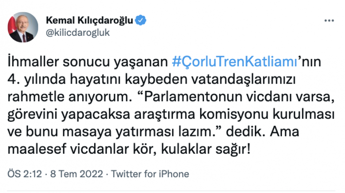 Kılıçdaroğlu Twitter hesabından yaptığı paylaşımda, "İhmaller sonucu yaşanan Çorlu Tren Katliamı’nın 4. yılında hayatını kaybeden vatandaşlarımızı rahmetle anıyorum. 'Parlamentonun vicdanı varsa, görevini yapacaksa araştırma komisyonu kurulması ve bunu masaya yatırması lazım' dedik. Ama maalesef vicdanlar kör, kulaklar sağır!" ifadesini kullandı.
