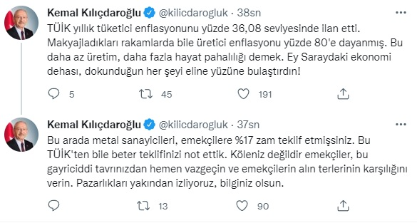 CHP Genel Başkanı Kemal Kılıçdaroğlu, kapılarını kapatarak kendisini içeri almayan Türkiye İstatistik Kurumu’nun (TÜİK) bugün açıkladığı enflasyon rakamıyla ilgili, “Makyajladıkları rakamlarda bile üretici enflasyonu yüzde 80'e dayanmış. Bu daha az üretim, daha fazla hayat pahalılığı demek” dedi. Ana muhalefet lideri, Cumhurbaşkanı ve AKP Genel Başkanı Recep Tayyip Erdoğan’a, “Ey Saraydaki ekonomi dehası, dokunduğun her şeyi eline yüzüne bulaştırdın!” diye seslendi.