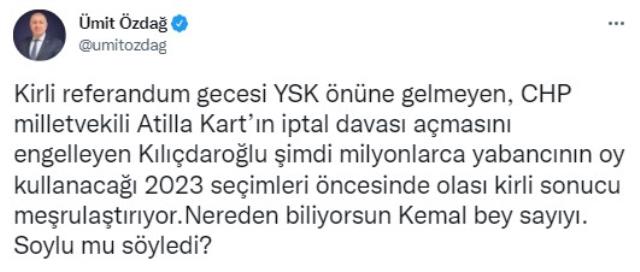 Kılıçdaroğlu'nun bu sözlerine Ümit Özdağ'dan tepki geldi. Sosyal medya üzerinden bir açıklama yapan Özdağ, "Kirli referandum gecesi YSK önüne gelmeyen, CHP milletvekili Atilla Kart'ın iptal davası açmasını engelleyen Kılıçdaroğlu şimdi milyonlarca yabancının oy kullanacağı 2023 seçimleri öncesinde olası kirli sonucu meşrulaştırıyor. Nereden biliyorsun Kemal bey sayıyı. Soylu mu söyledi?" ifadelerini kullandı.