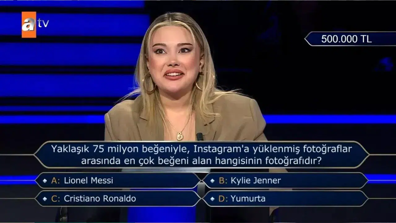 Yarışmacıya, “Yaklaşık 75 milyon beğeniyle Instagram’a yüklenmiş fotoğraflar arasında en çok beğeni alan hangisinin fotoğrafıdır?” sorusu yöneltildi. Bu kritik soruda yarışmacı, daha önce bu bilgiyi okuduğunu belirterek oldukça emin bir tavır sergiledi.