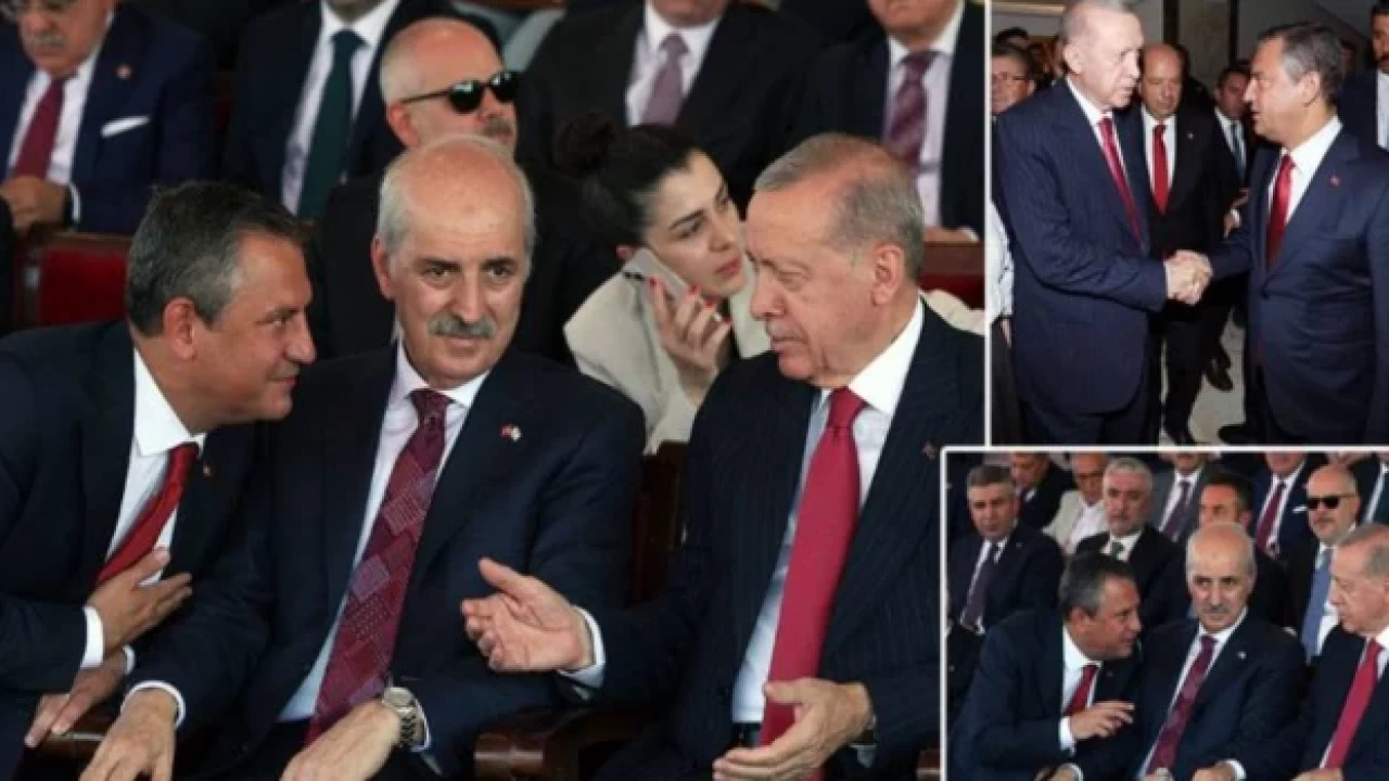 Törende protokol gereği Cumhurbaşkanı Erdoğan, TBMM Başkanı Kurtulmuş ve CHP lideri Özel, yan yana oturdu. 31 Mart yerel seçimlerinin ardından karşılıklı ziyaretlerle bir araya gelerek "yumuşama" mesajı veren Erdoğan ve Özel'in sohbet etmesi dikkati çekti. İki liderin arasında geçen konuşmanın içeriği hakkında henüz bilgi alınamadı.