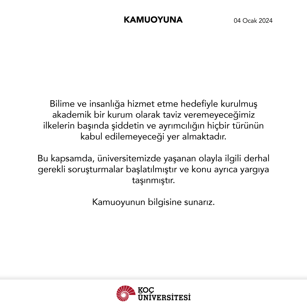 "Bilime ve insanlığa hizmet etme hedefiyle kurulmuş akademik bir kurum olarak taviz veremeyeceğimiz ilkelerin başında şiddetin ve ayrımcılığın hiçbir türünün kabul edilemeyeceği yer almaktadır. Bu kapsamda üniversitemizde yaşanan olayla ilgili derhal gerekli soruşturmalar başlatılmıştır ve konu ayrıca yargıya taşınmıştır."