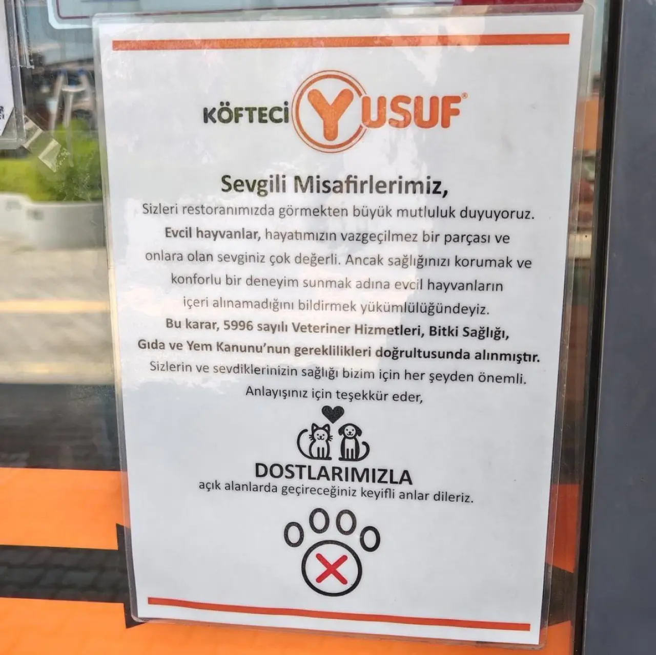 Türkiye’nin önde gelen gıda zincirlerinden Köfteci Yusuf, şubelerinde evcil hayvanların iç mekanlara girişini yasakladığını duyurdu. Kararın ardından işletmenin tüm şubelerine bilgilendirici afişler asıldı. Afişlerde yasağın, 5996 sayılı "Veteriner Hizmetleri, Bitki Sağlığı, Gıda ve Yem Kanunu" kapsamında alındığı belirtildi.