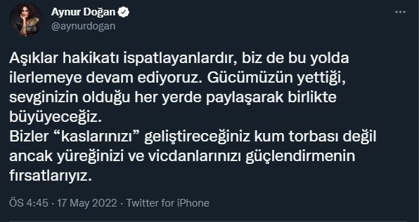 Doğan’a siyasilerden ve sanatçılardan destek mesajları geldi. Doğan ise bugün sosyal medya hesabı üzerinden, “Aşıklar hakikati ispatlayanlardır, biz de bu yolda ilerlemeye devam ediyoruz. Gücümüzün yettiği, sevginizin olduğu her yerde paylaşarak birlikte büyüyeceğiz. Bizler ‘kaslarınızı’ geliştireceğiniz kum torbası değil ancak yüreğinizi ve vicdanlarınızı güçlendirmenin fırsatlarıyız” açıklamasını yaptı.