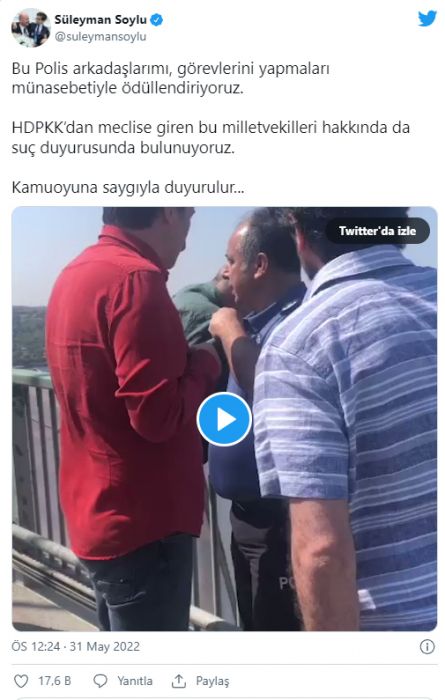 Soylu, "Bu polis arkadaşlarımı, görevlerini yapmaları münasebetiyle ödüllendiriyoruz. HDPKK'dan meclise giren bu milletvekilleri hakkında da suç duyurusunda bulunuyoruz" notunu da paylaştı.