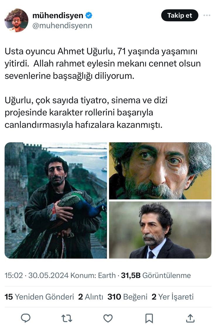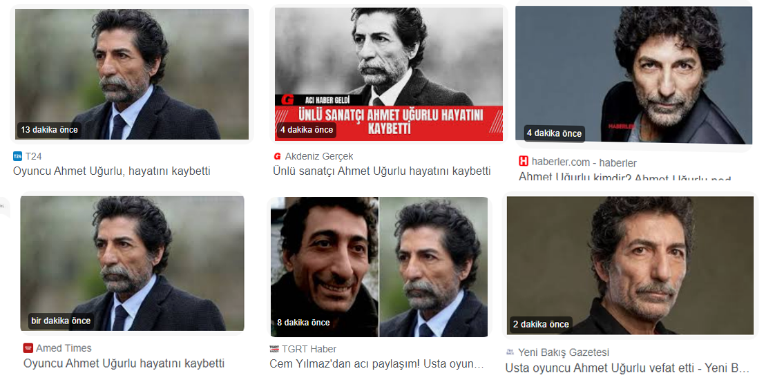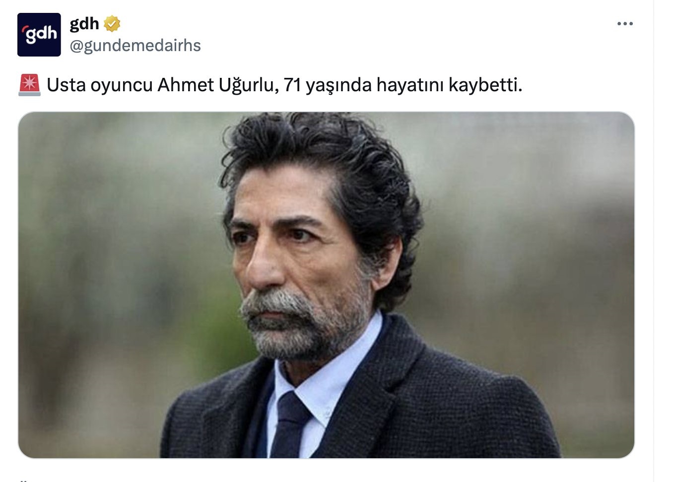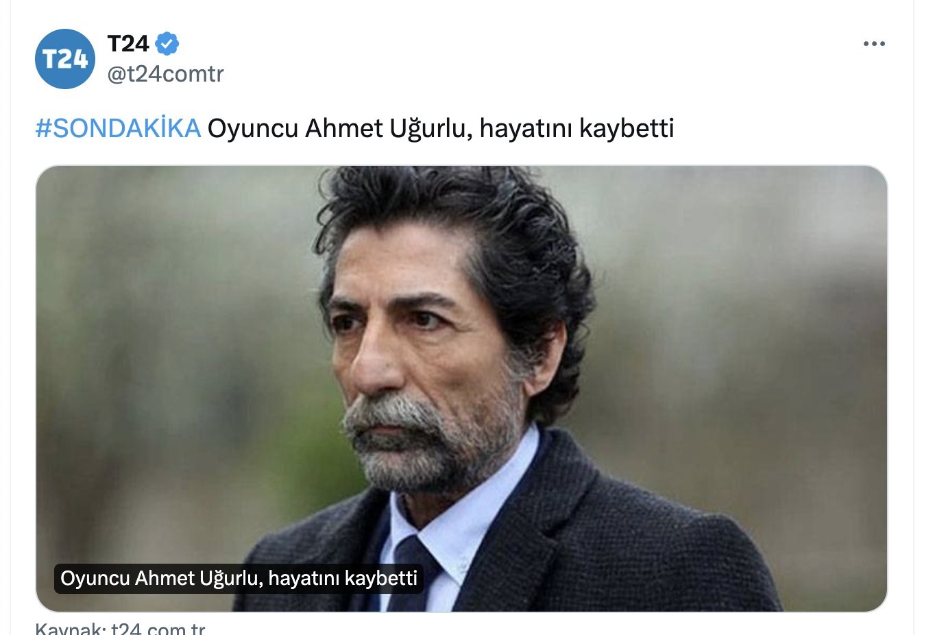 Usta tiyatro ve sinema oyuncusu Ahmet Uğurlu, 30 Mayıs 2024 (dün) tarihinde hayatını kaybetti. Uğurlu’nun vefat haberini duyuran haber siteleri ve sadece sosyal medya üzerinden yayın yapan haber sayfaları Ahmet Uğurlu’nun vefat haberinde kendisi gibi oyuncu kardeşi Mustafa Uğurlu’nun fotoğraflarını kullandılar.