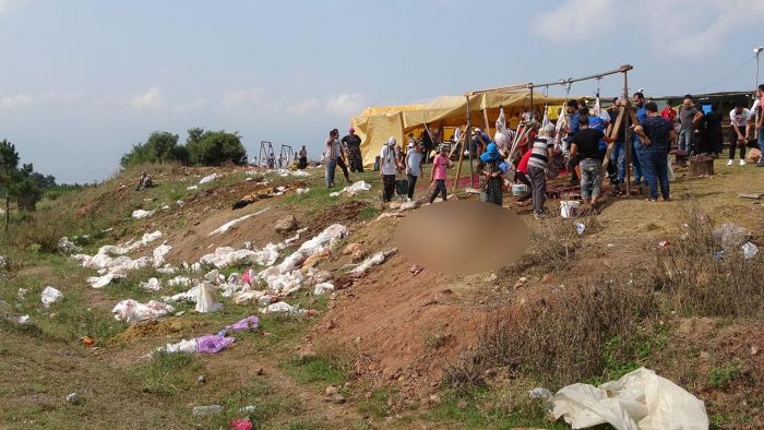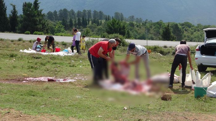 Kocaeli'nin Derince ilçesinde kurbanlık hayvanlarını alan bazı kişiler, arazide uygunsuz koşullarda kesim yaptı. Derince'nin Çınarlı Mahallesi'nde kurulan kurbanlık pazarından hayvan satın alanlar, kendi imkanlarıyla arazide kesti. Uygunsuz koşullarda kesilen hayvanların kanları, etrafa akarken, derilerinin de bölgedeki tellere asıldığı görüldü. Kesime çocuklarını da getirenler, balta ve satırlarla parçalanan etleri evlerine götürdü. Kurbanlıkların bazı organlarının ise araziye atıldığı görüldü.
