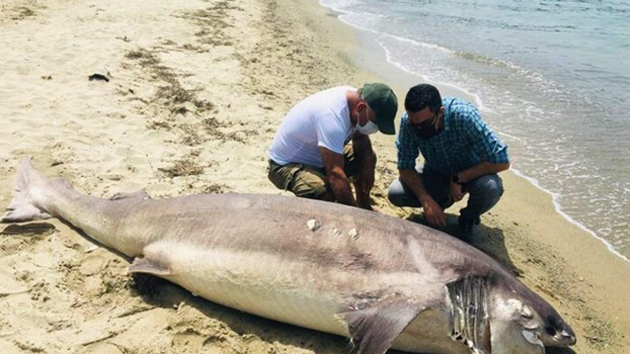 Aydın'ın Kuşadası ilçesinde 3.7 metre uzunluğunda 'boz camgöz' cinsi bir köpek balığı sahilde ölü olarak bulundu. Ekosistemi Koruma ve Doğa Sevenler Derneği (EKODOSD) yetkilileri köpek balığının kesin ölüm nedenini belirlemek için çalışma başlattı.