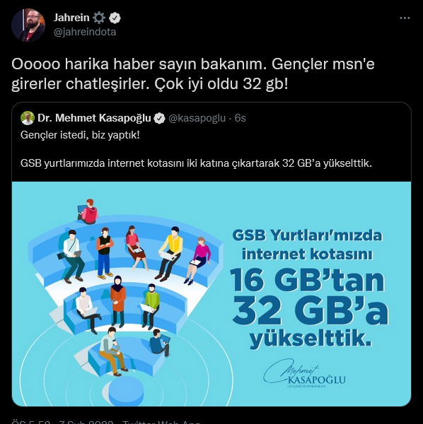 "Gençler istedi, biz yaptık! GSB yurtlarımızda internet kotasını iki katına çıkartarak 32 GB'a yükselttik."