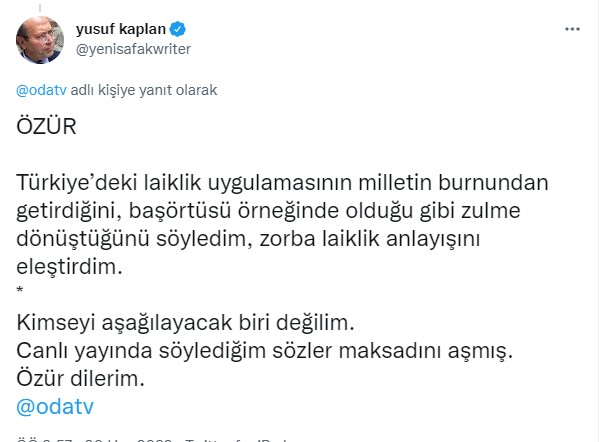 "Türkiye’deki laiklik uygulamasının milletin burnundan getirdiğini, başörtüsü örneğinde olduğu gibi zulme dönüştüğünü söyledim, zorba laiklik anlayışını eleştirdim. Kimseyi aşağılayacak biri değilim. Canlı yayında söylediğim sözler maksadını aşmış. Özür dilerim."