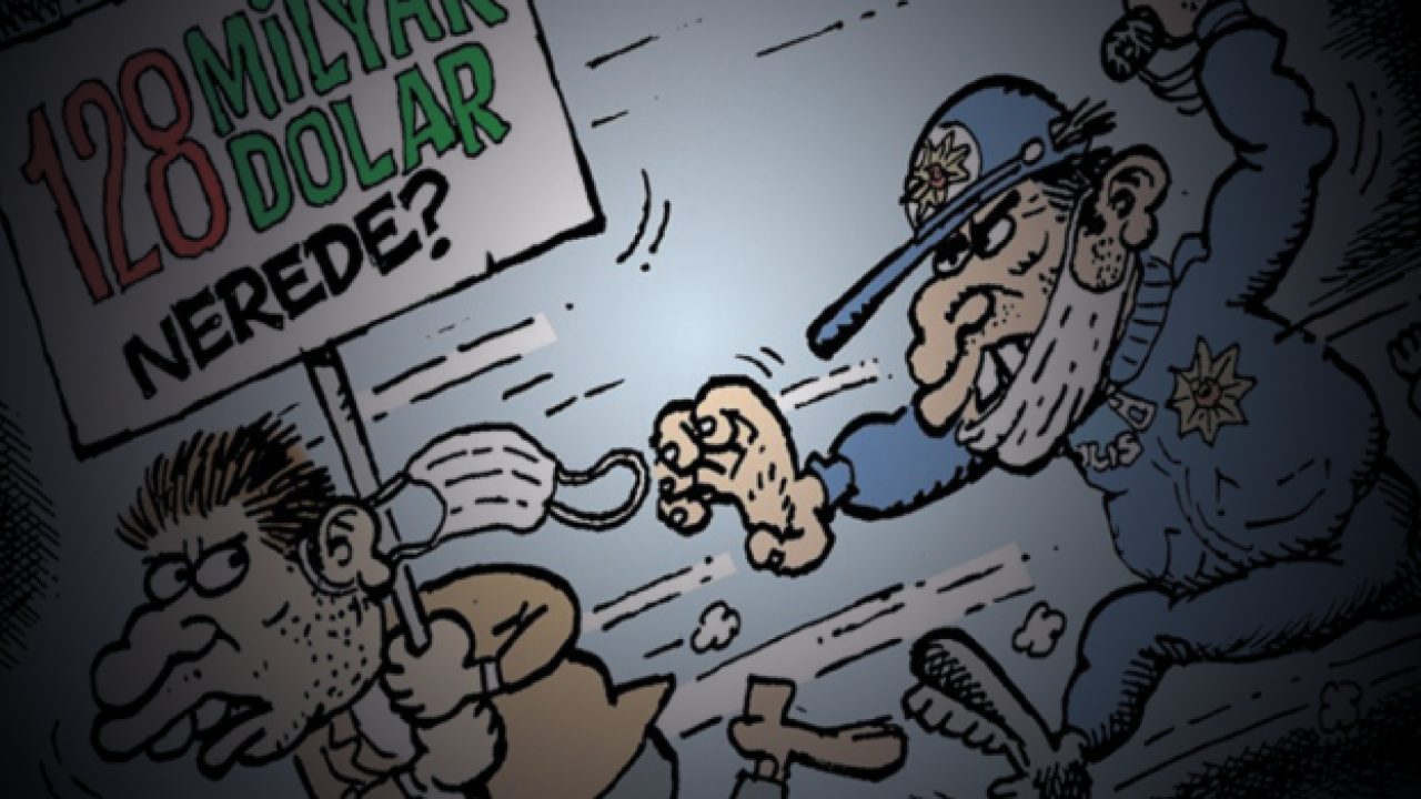 Mizah dergisi LeMan, bu haftaki kapağında, 128 Milyar Dolar Nerede? pankartını taşıyan gencin polis tarafından kovalanmasını kaleme aldı.