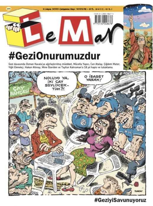 Mizah Dergisi Leman, bu haftaki kapağına Gezi Davası'nda Osman Kavala, Mücella Yapıcı, Çiğdem Mater, Hakan Altınay, Can Atalay, Mine Özerden, Yiğit Ali Ekmekçi, Tayfun Kahraman'a verilen cezaları taşıdı.